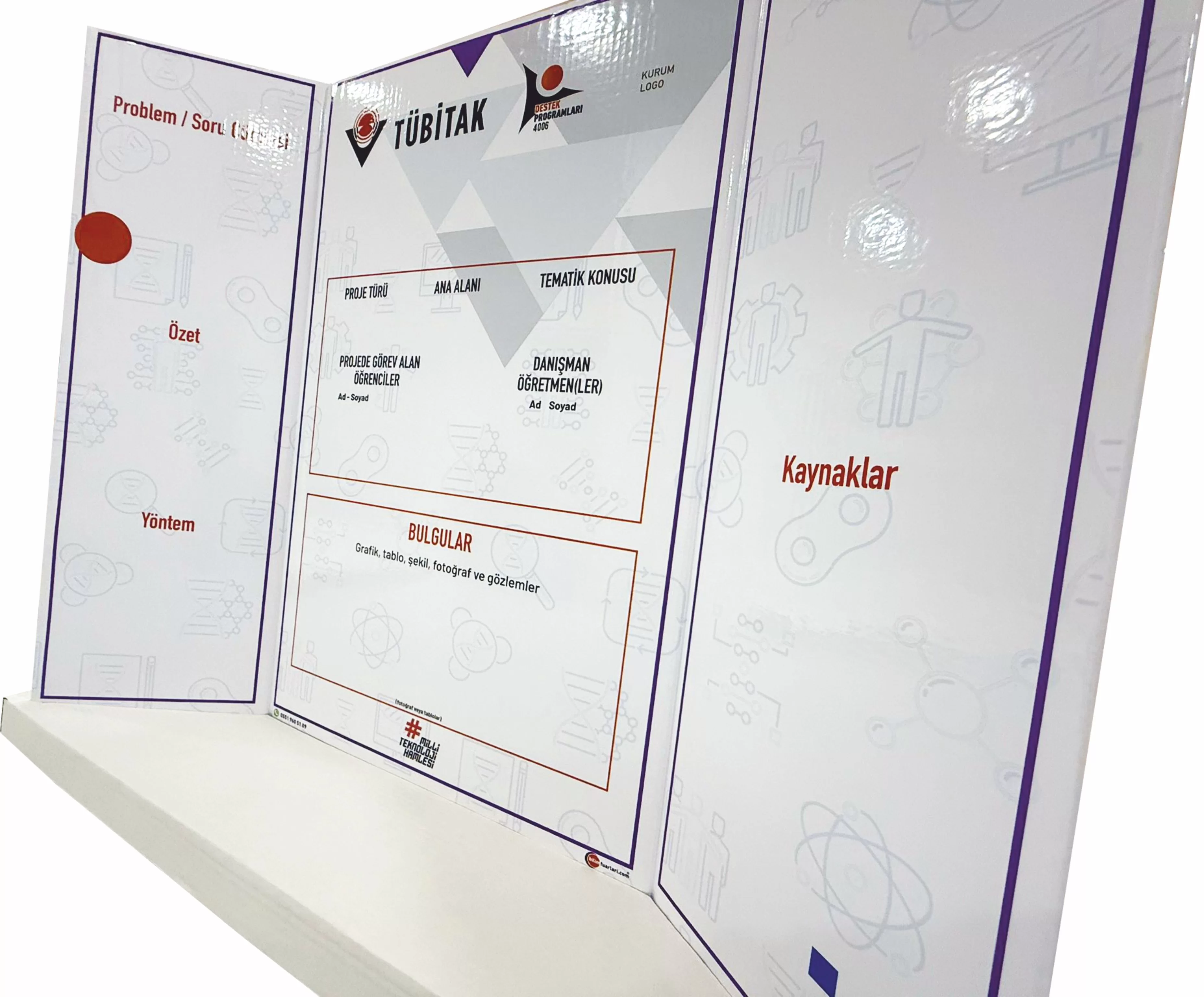 Özel Üretim Ayaklı Proje Standı. Yazı kısımları boş gelmektedir. Okul Logosu Etiket olarak Ücretsiz Gönderilecek. Oluklu Mukavva(Koli Kartonundan) Üretilmektedir.